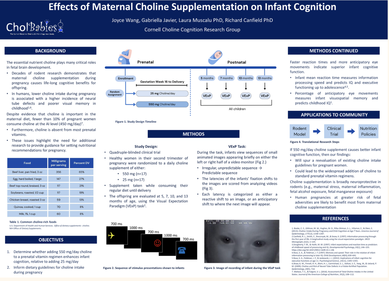 Cholbabies investigates the effects of prenatal choline supplementation vs. placebo on infant cognition in the areas of reaction time and anticipatory eye movements, which predicts working memory and problem-solving later in life.